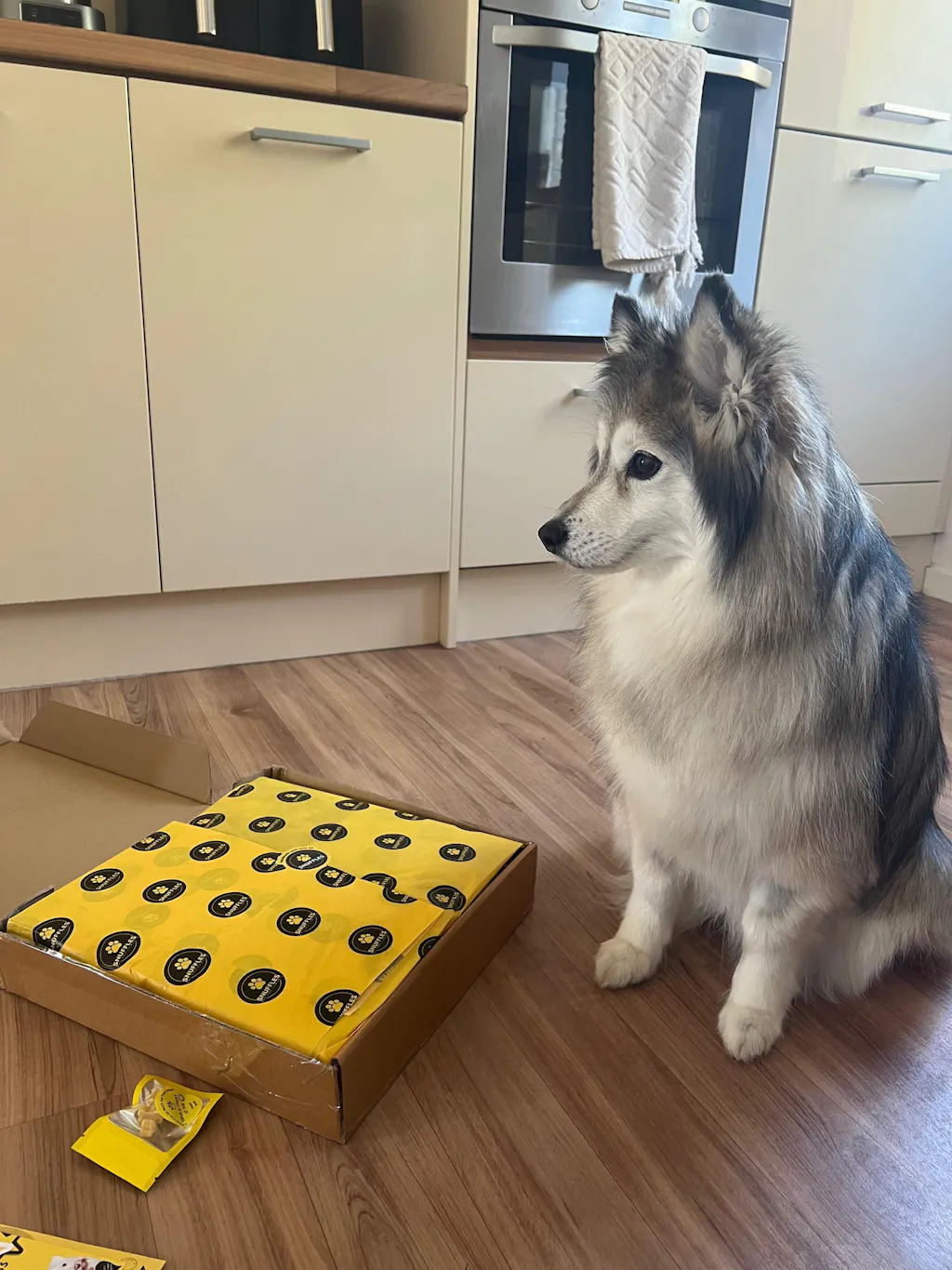 Arrived promptly, beautifully packaged. As soon as our dog smelt the box she was so excited. A free sample was provided which she loved. Very happy dog looking for her lamb bones in her snuffle mat. Highly recommended