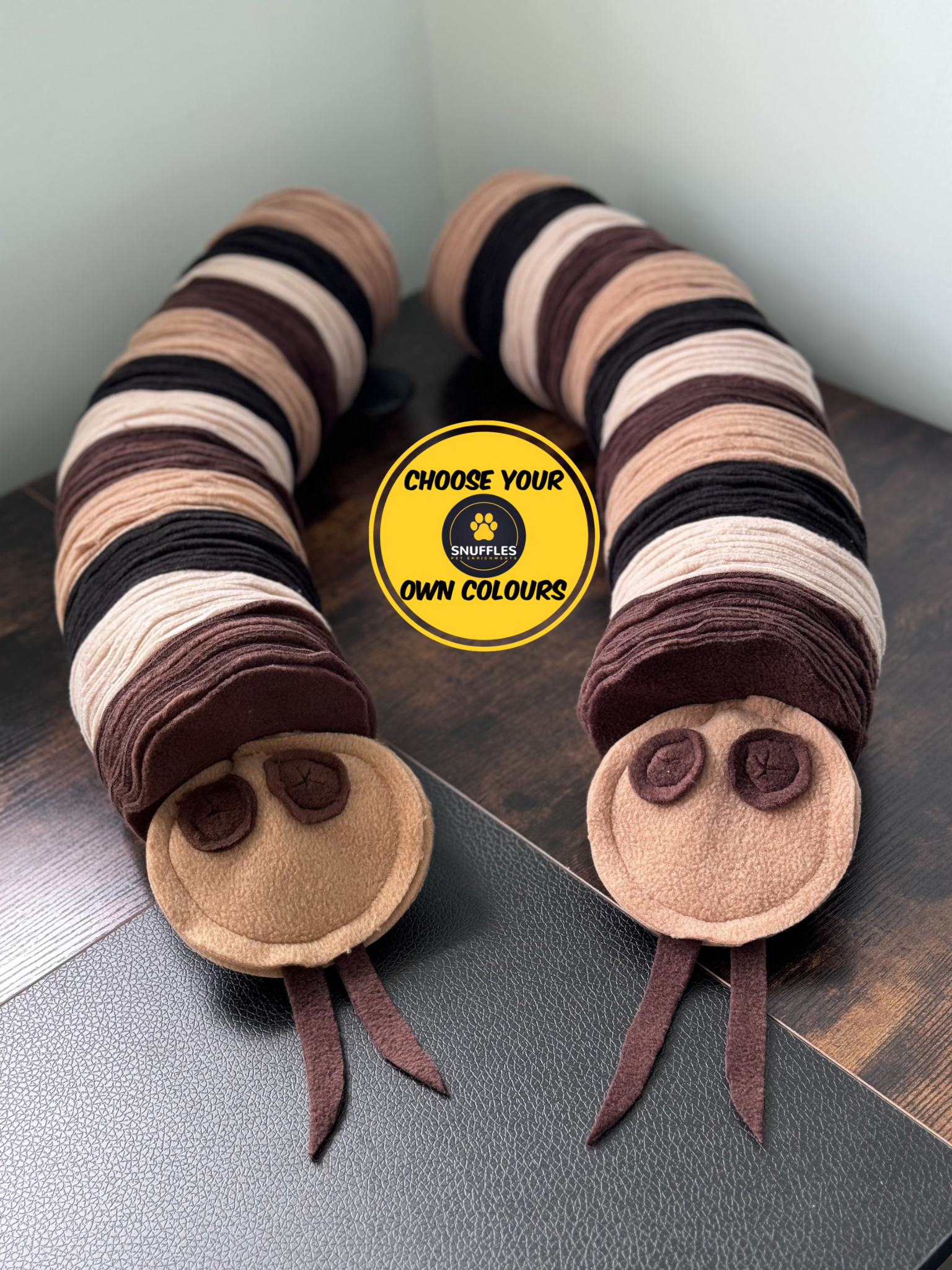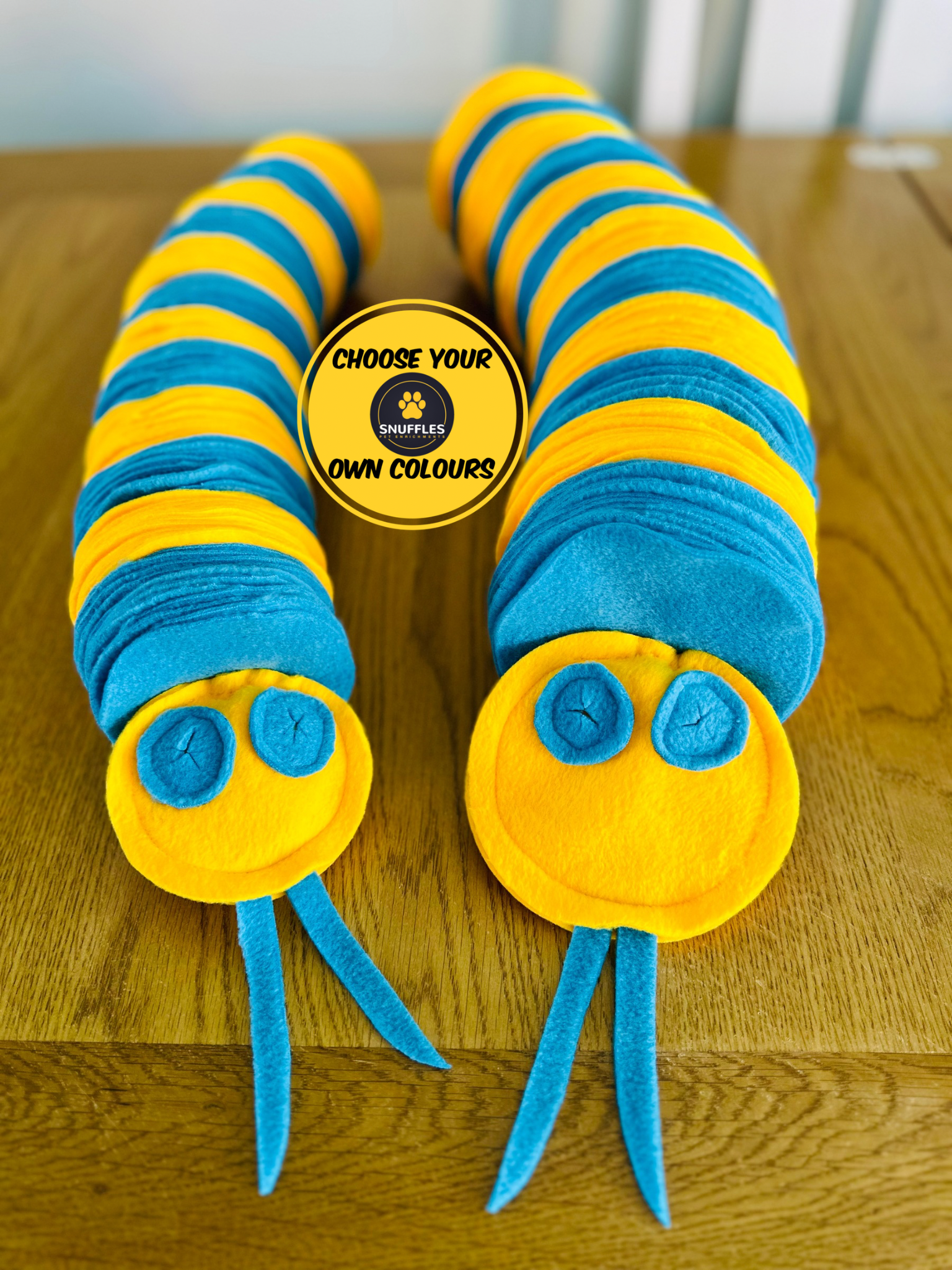The Custom Coloured Small Snuffle Snake is a fun, engaging enrichment toy designed to keep pets mentally stimulated and happily entertained. This long-lasting snuffle puzzle encourages natural foraging behaviour by hiding treats or kibble inside soft fleece layers.