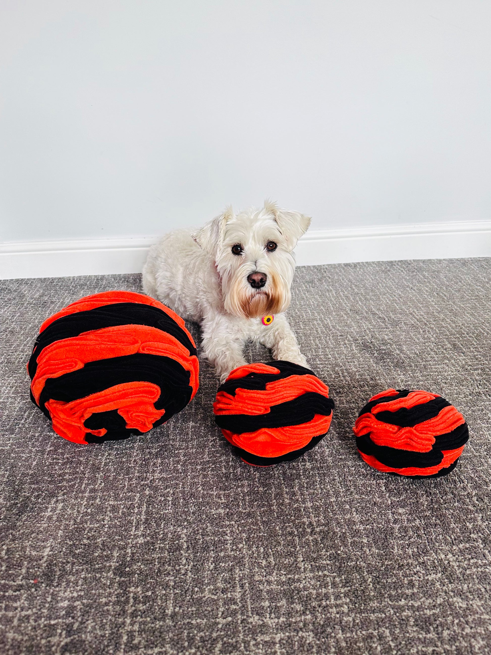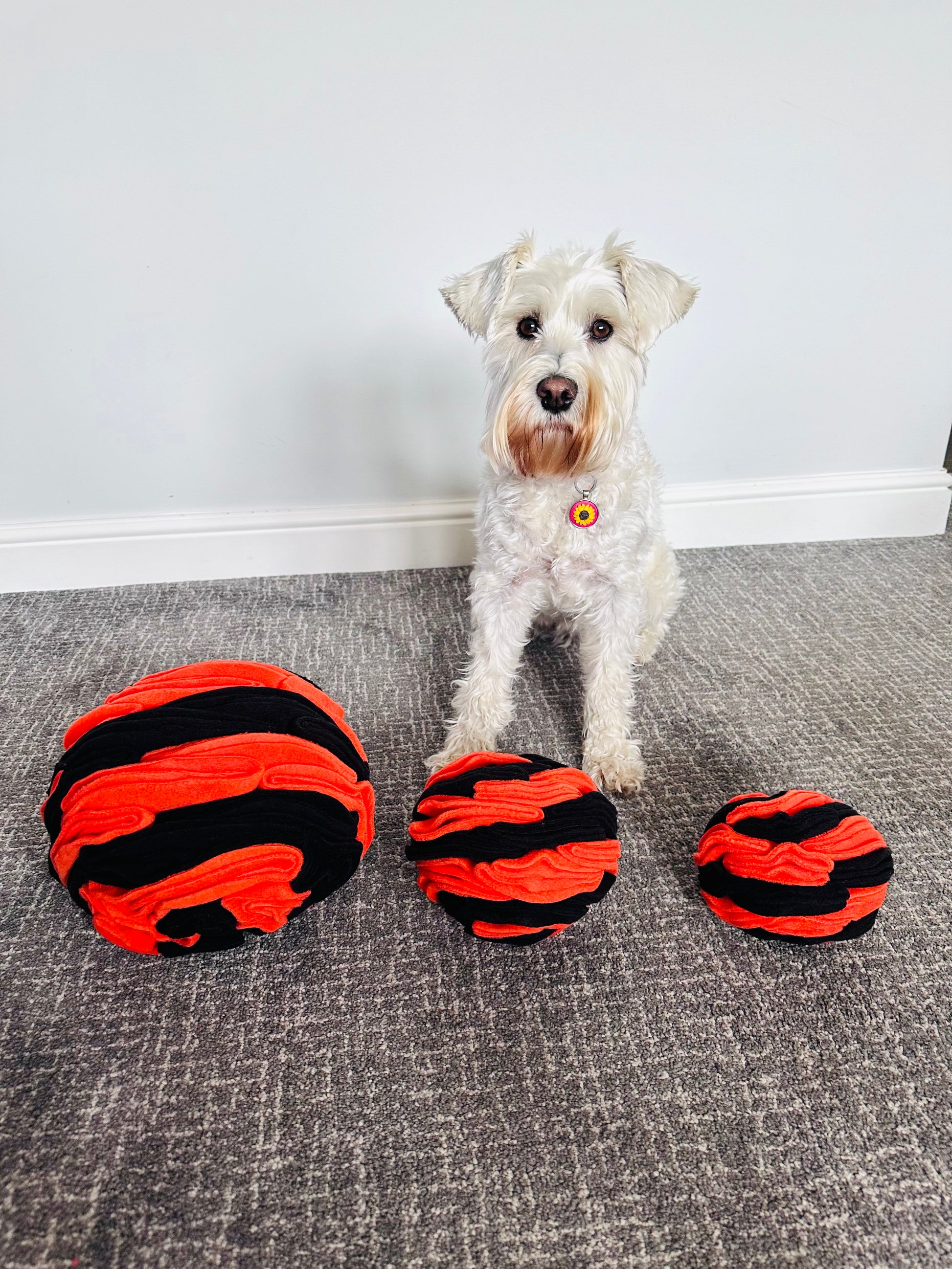 Made with top-quality thick anti-polar fleece in the Schnauzerfest orange & black themed colours, each size snuffle ball is designed to be chunky, tight, and provide plenty of hiding places for treats and kibble. Stimulate your pet's sense of smell and let them figure out how to retrieve the treats with this fun and exciting learning tool.