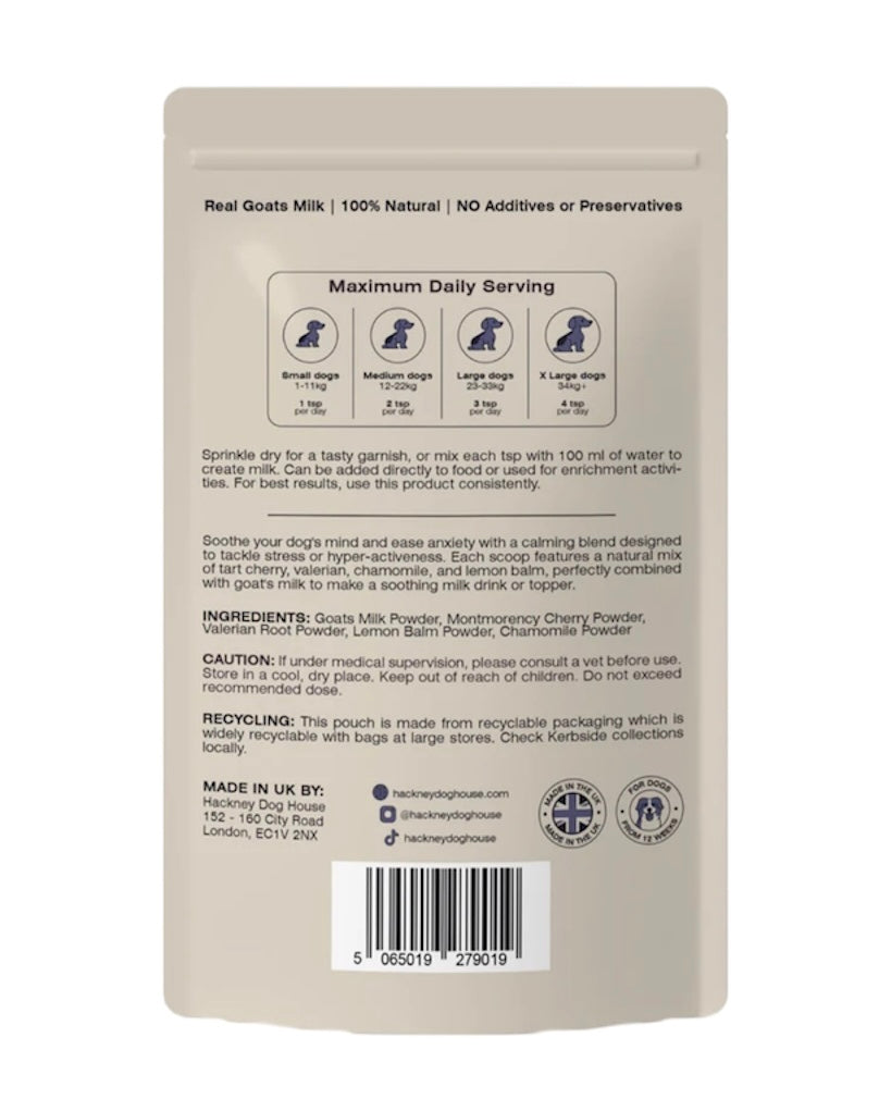 A calming blend designed to tackle stress, hyperactivity, and anxiety. A Natural blend of tart cherry, valerian, chamomile, and lemon balm, combined with whole goat's milk to make a soothing milk drink/topper.