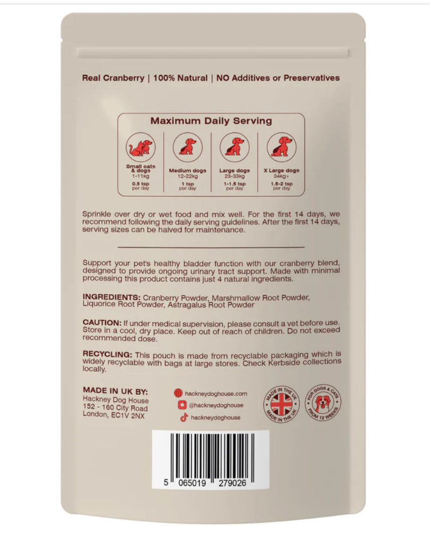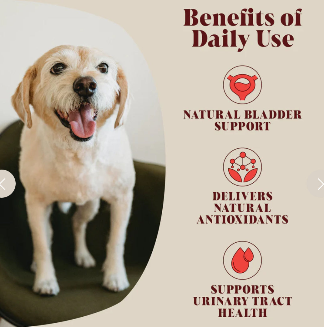 Give your dog's bladder the support it needs with our cranberry blend. Crafted to maintain urinary tract health, our product contains 4 natural ingredients, minimally processed for optimal quality. Perfect for pets prone to recurring UTIs.