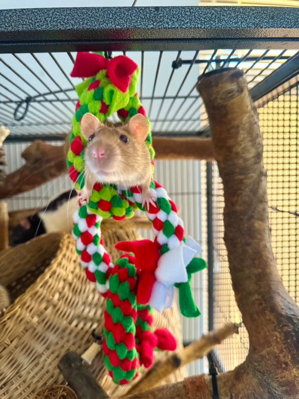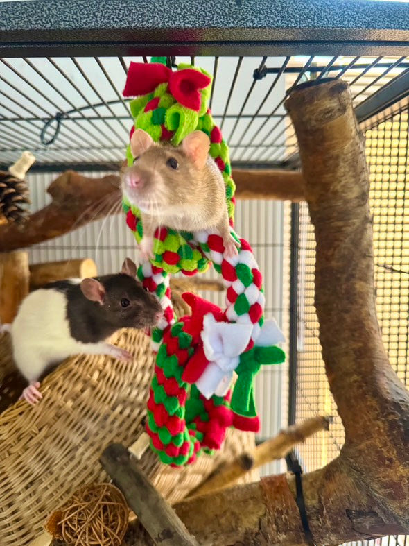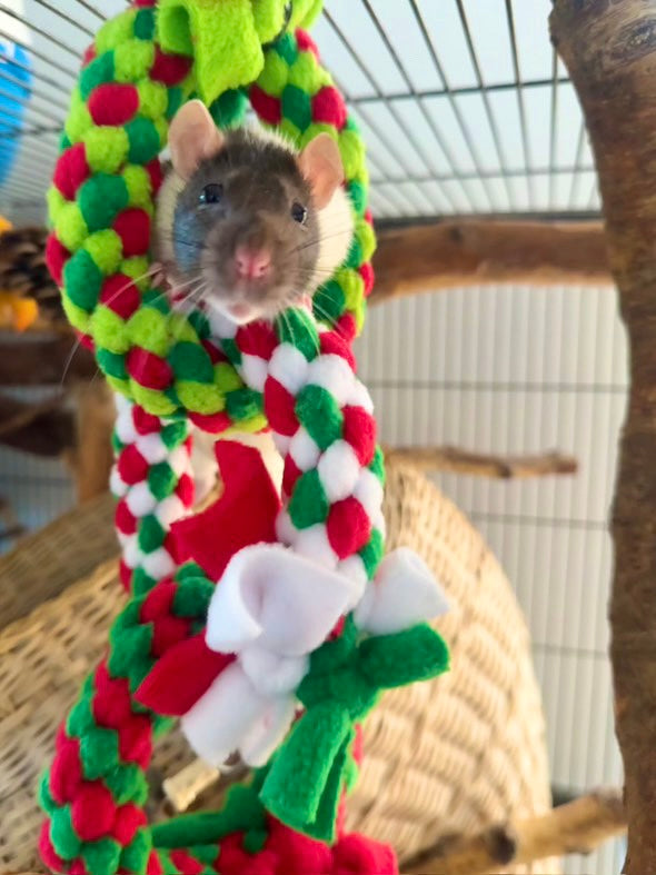 Available in sets of 3 or 6 links joined together to hang in your rats enclosure, each tug is crafted from a pet safe fleece plain or patterned that can withstand enthusiastic play.