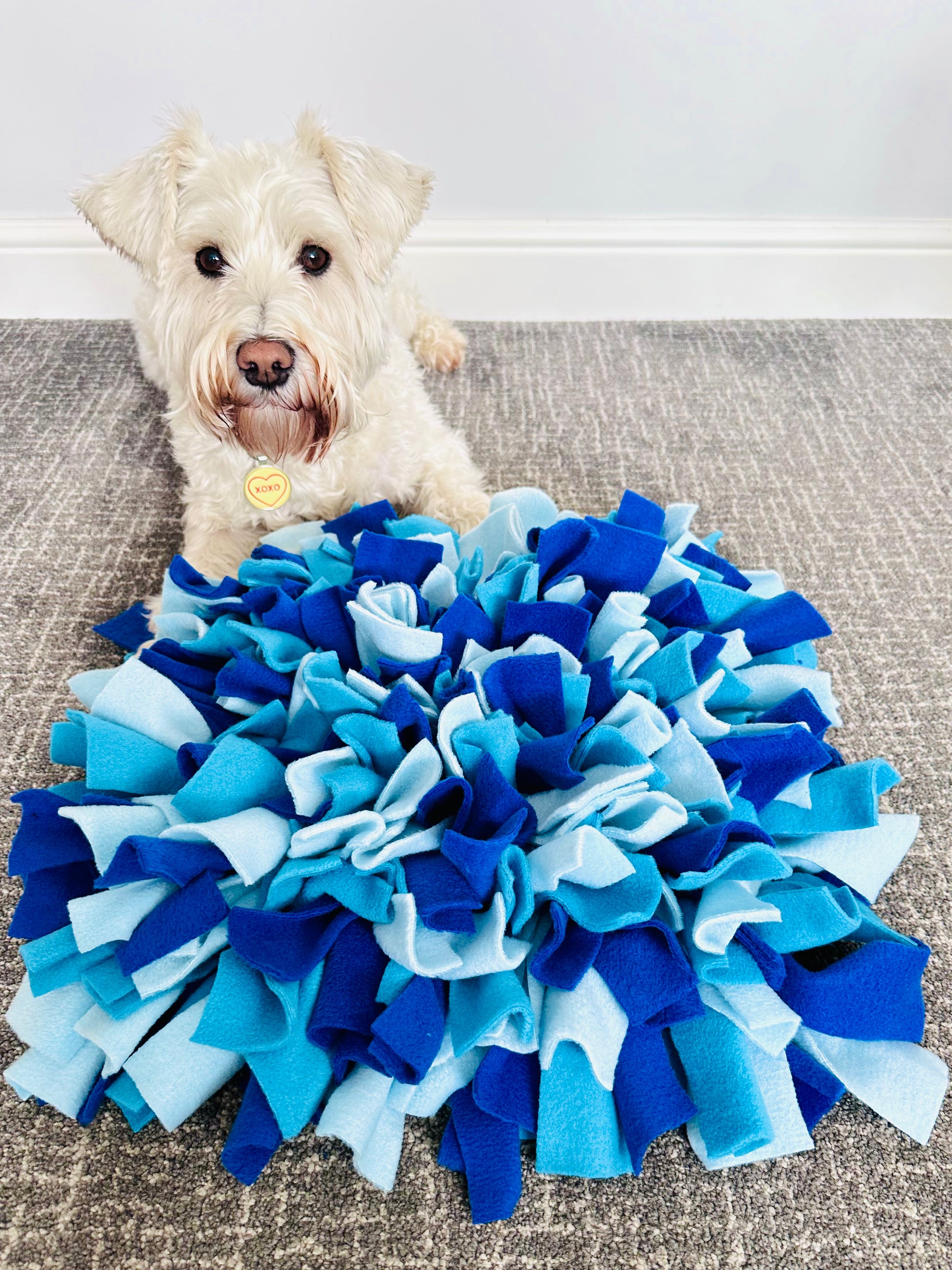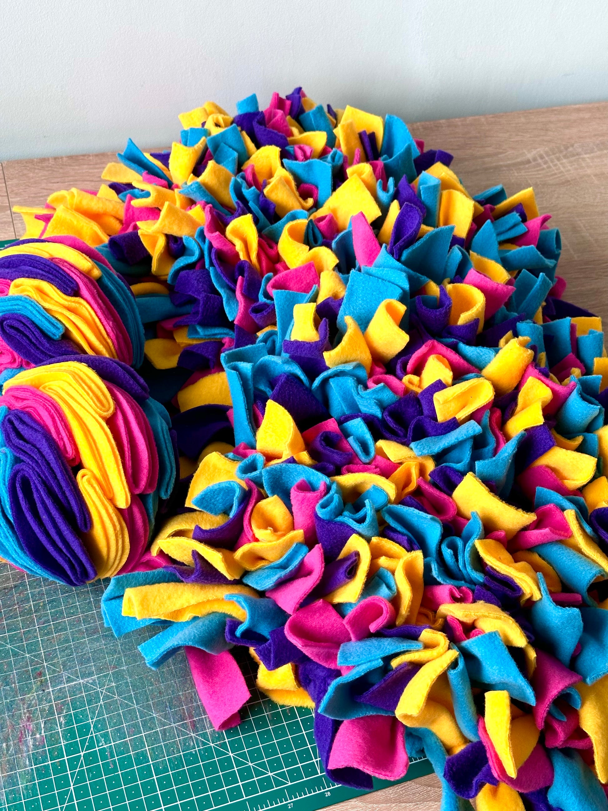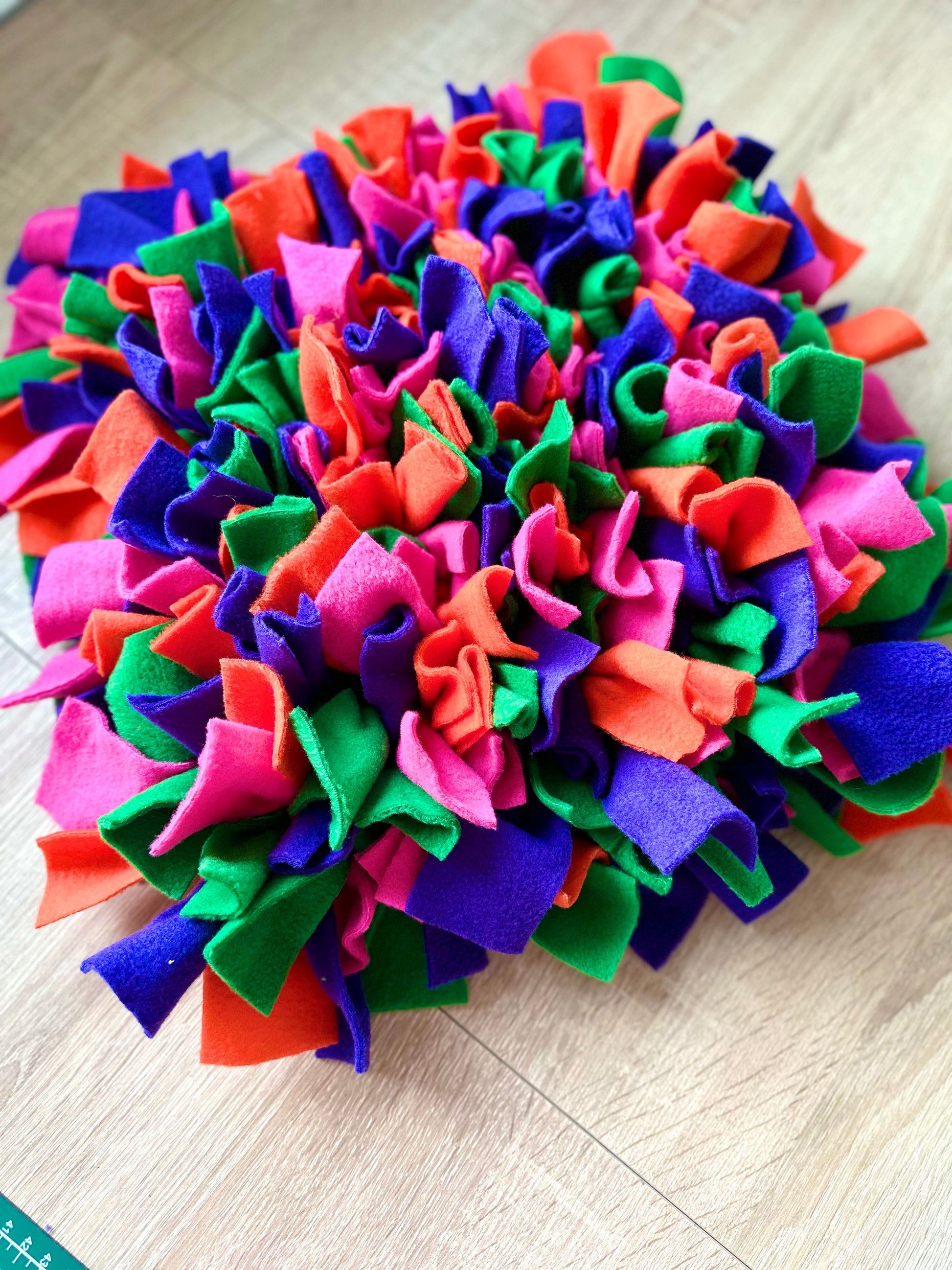 Handcrafted using top-quality plain polar fleece, this medium-sized snuffle mat measures 30x30cm and weighs 1.5kg when made.