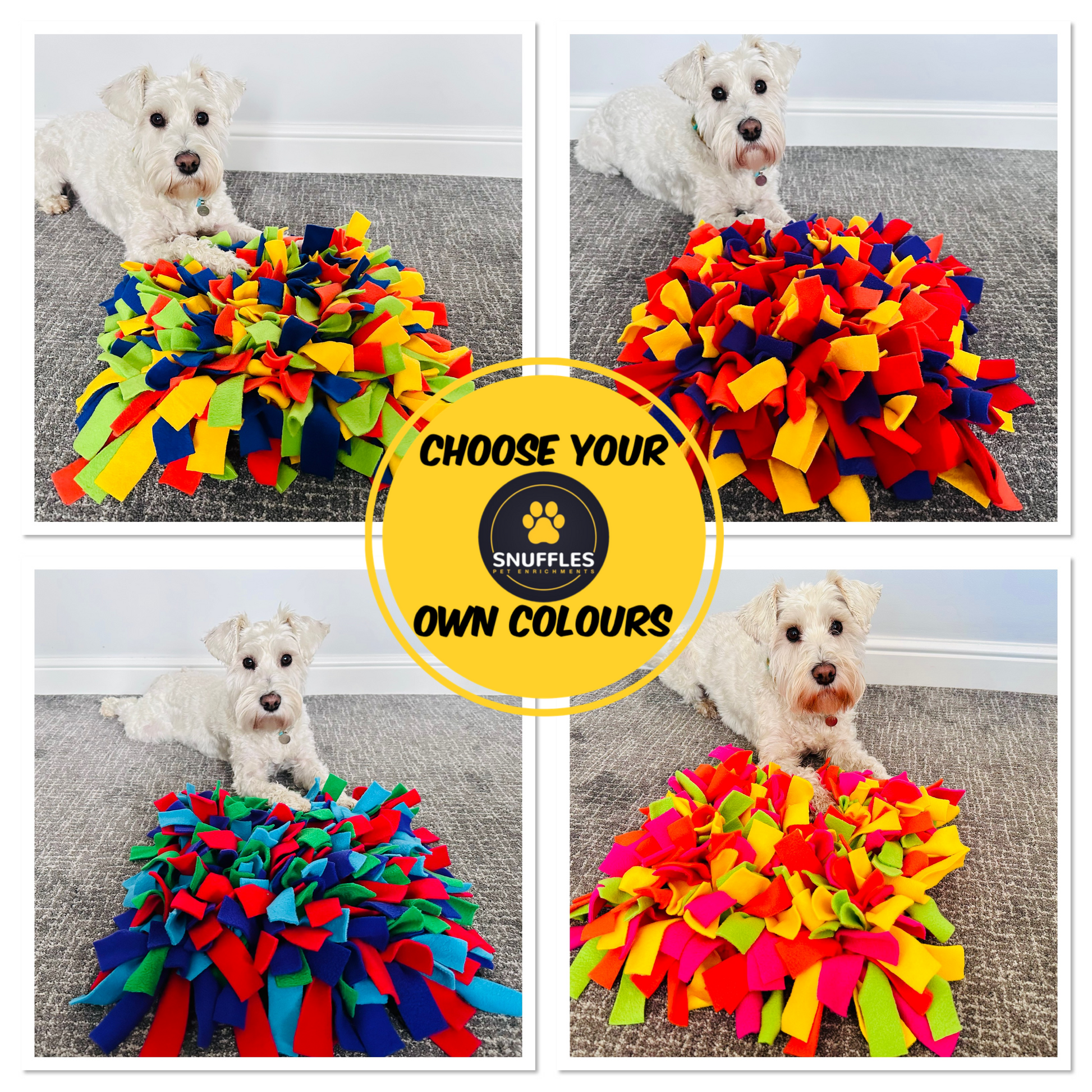 PLEASE ADD YOUR COLOUR OPTIONS SHOWN EXACTLY ON THE COLOUR CHART TO THE CUSTOMISED BOX & CHOOSE AS MANY COLOUR OPTIONS AS YOU LIKE TO CREATE YOUR PETS UNIQUE CUSTOM MADE SNUFFLE MAT,
