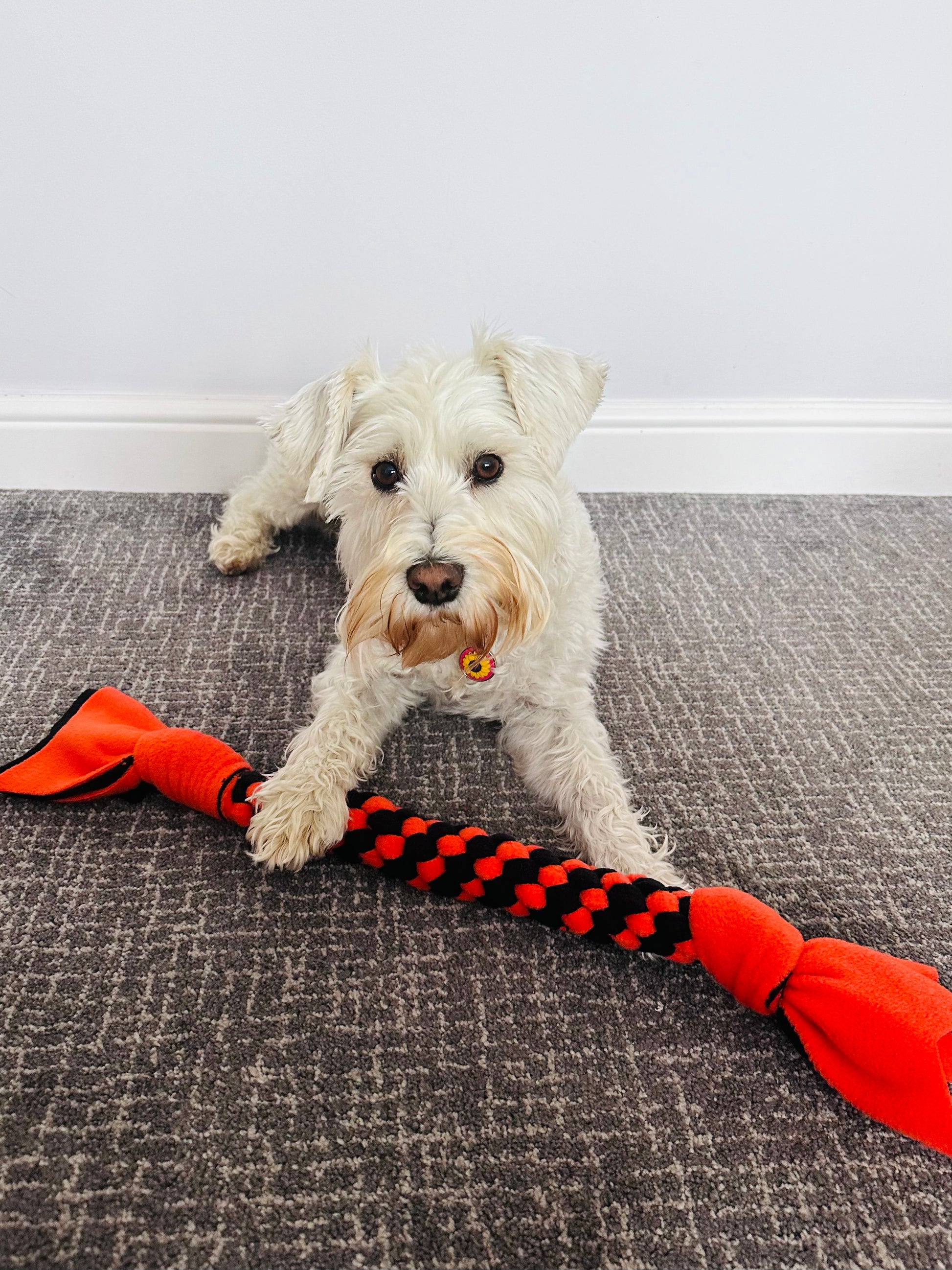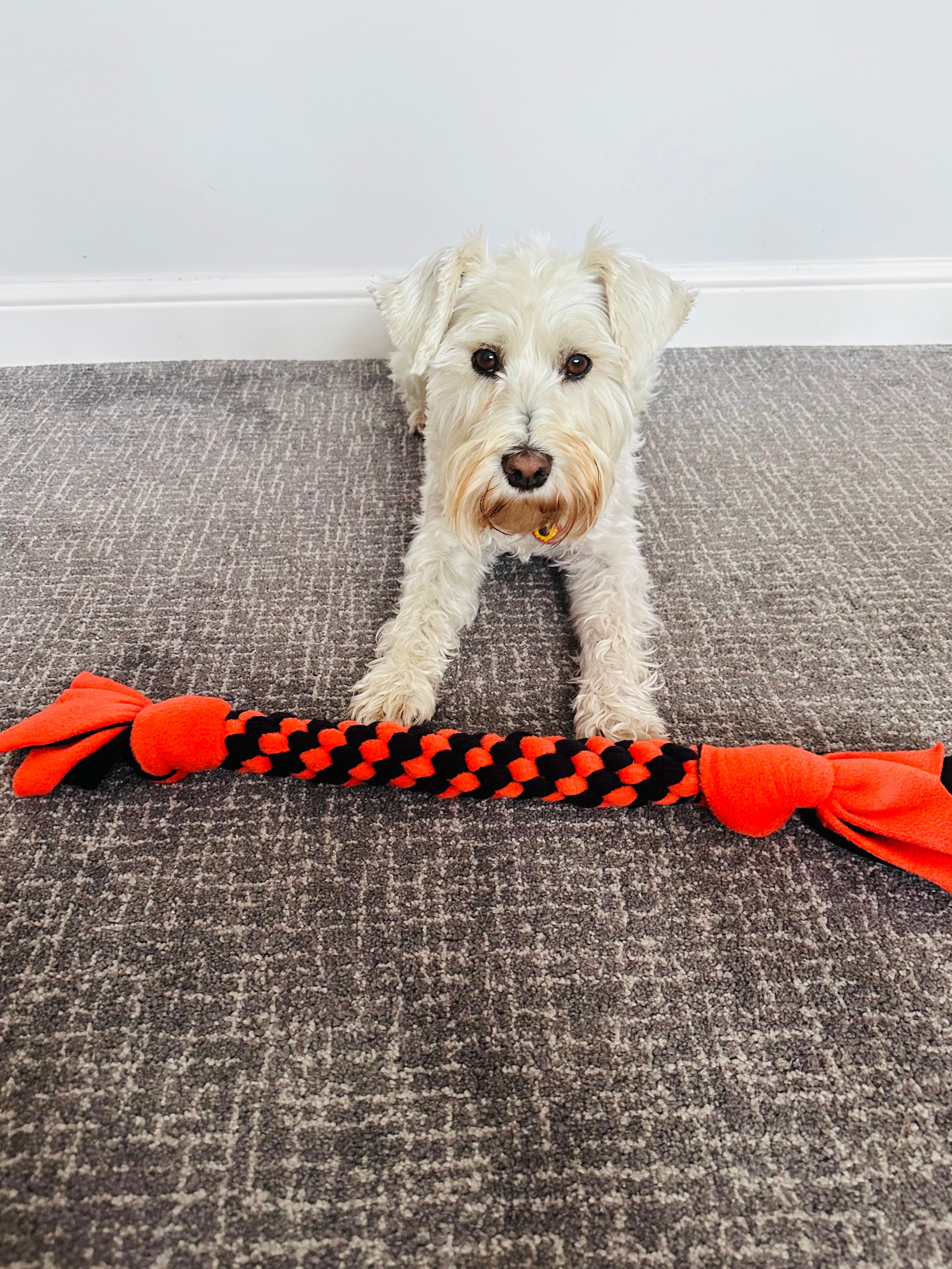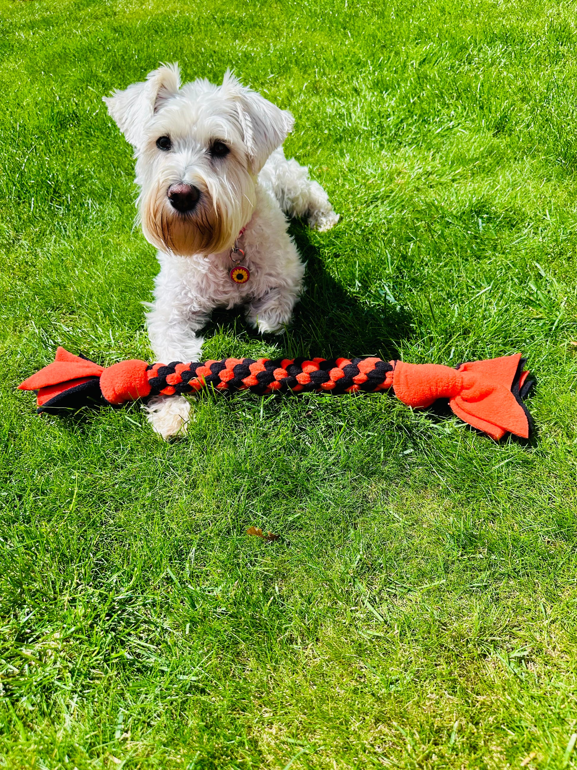Introducing our Schnauzerfest themed orange & black Dog Tug, the perfect toy for all size dog breeds! This pull fleece dog toy is designed for recall training and provides hours of fun for your furry friend. Tugs are a fabulous way of strengthะตning the bond between owners and dog, they promote confidence, control, and are a great motivational training activity that taps into your dog's natural drive instincts.