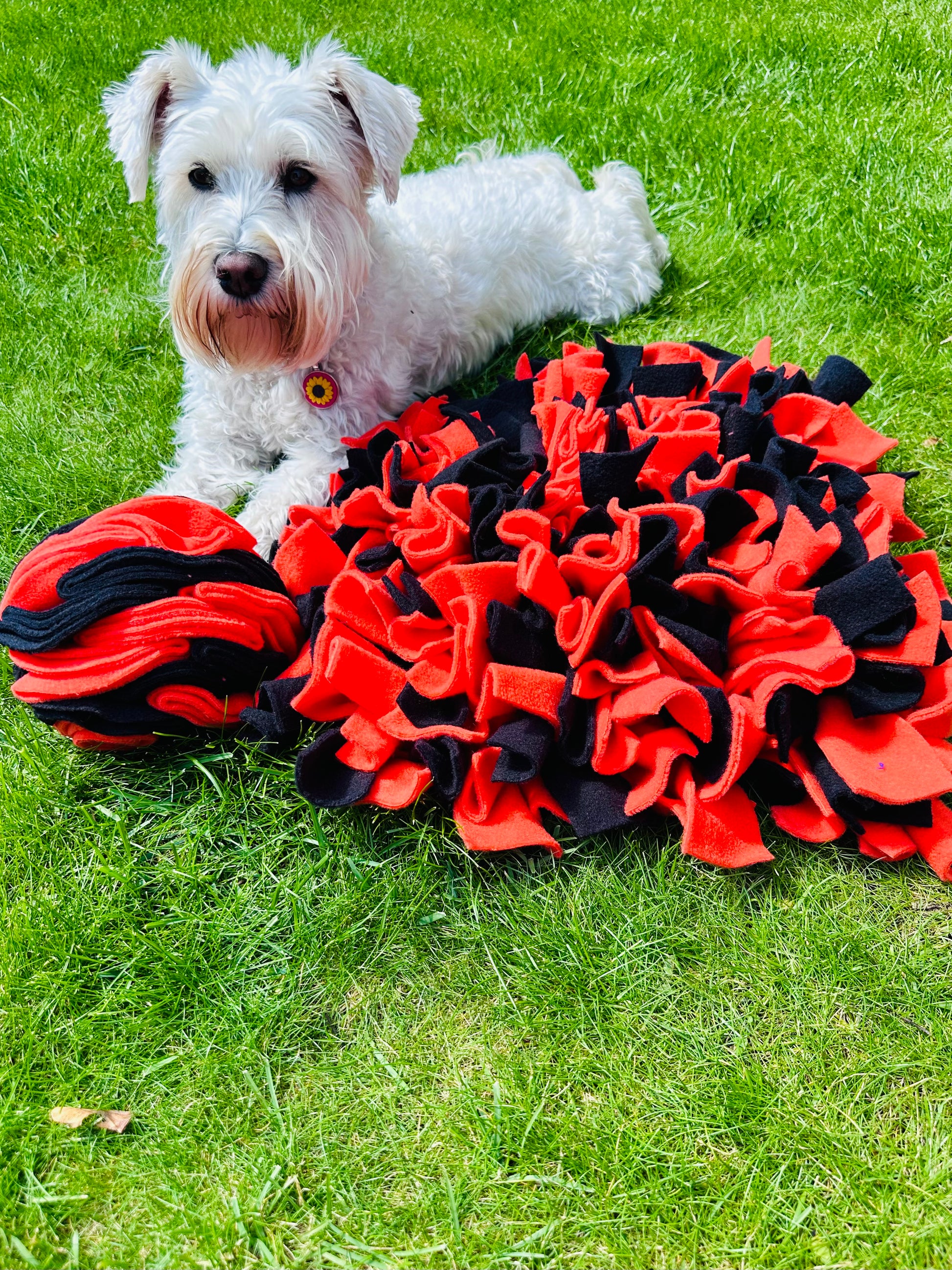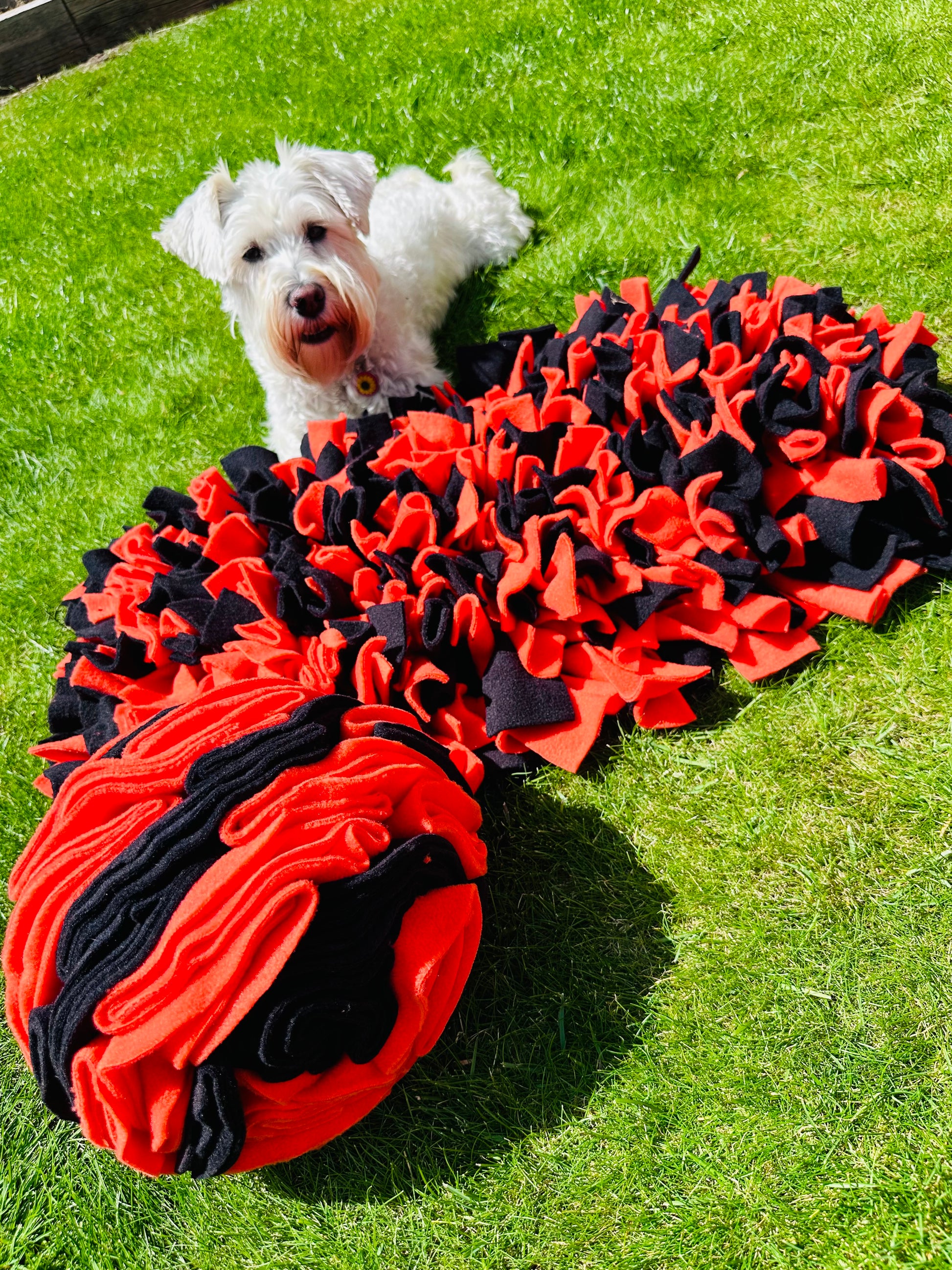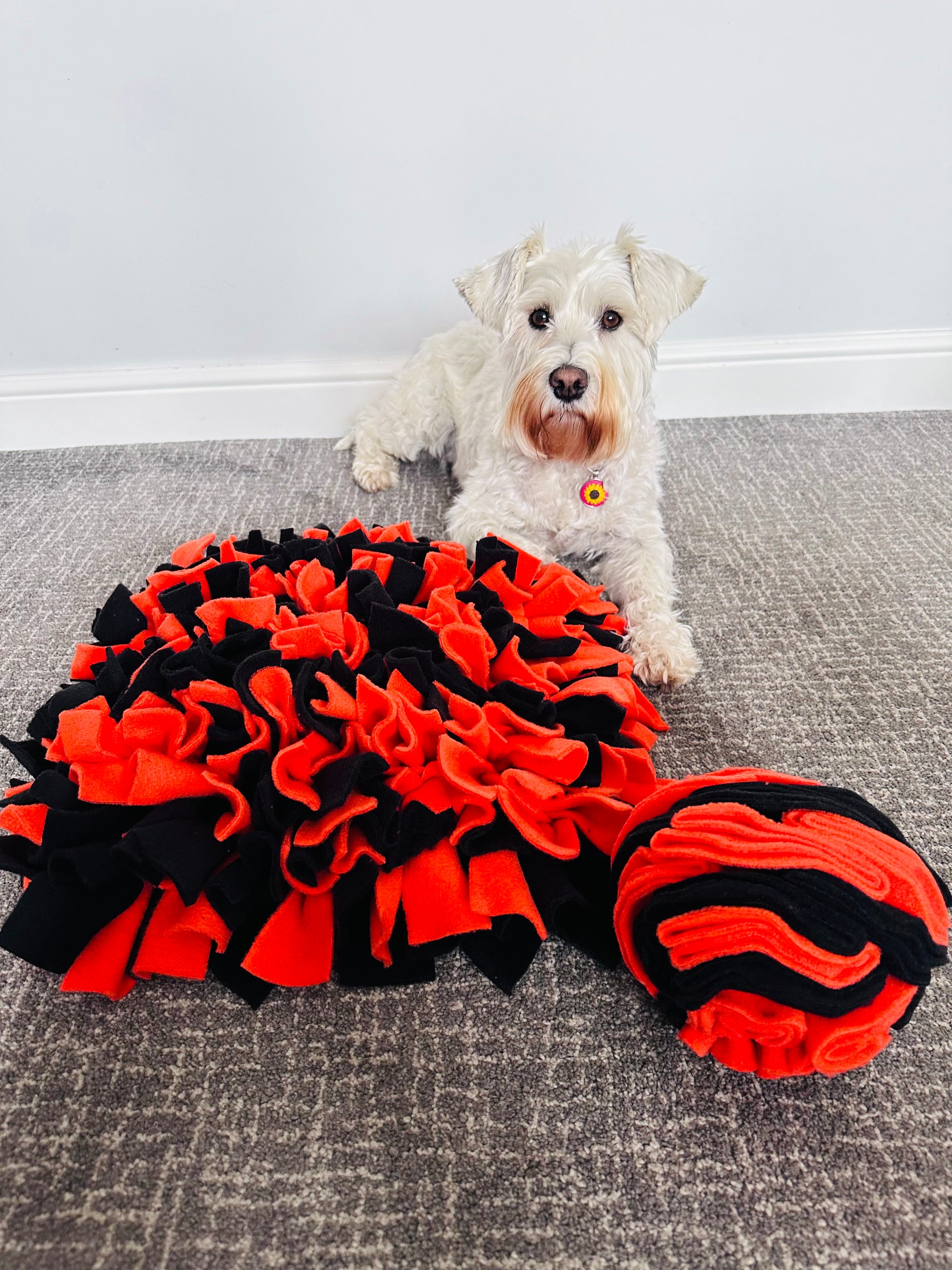 Each Snuffle Mat and Ball are made with high-quality orange & black Schnauzerfest themed polar fleece.